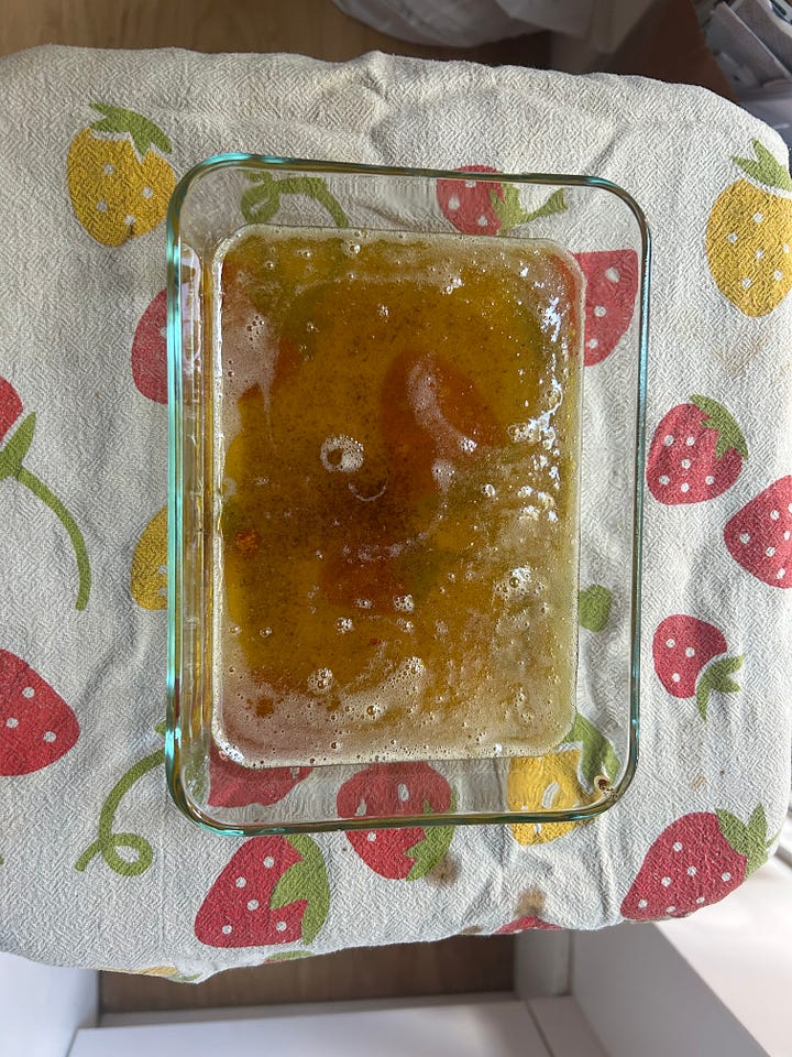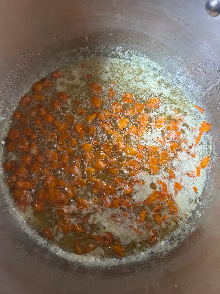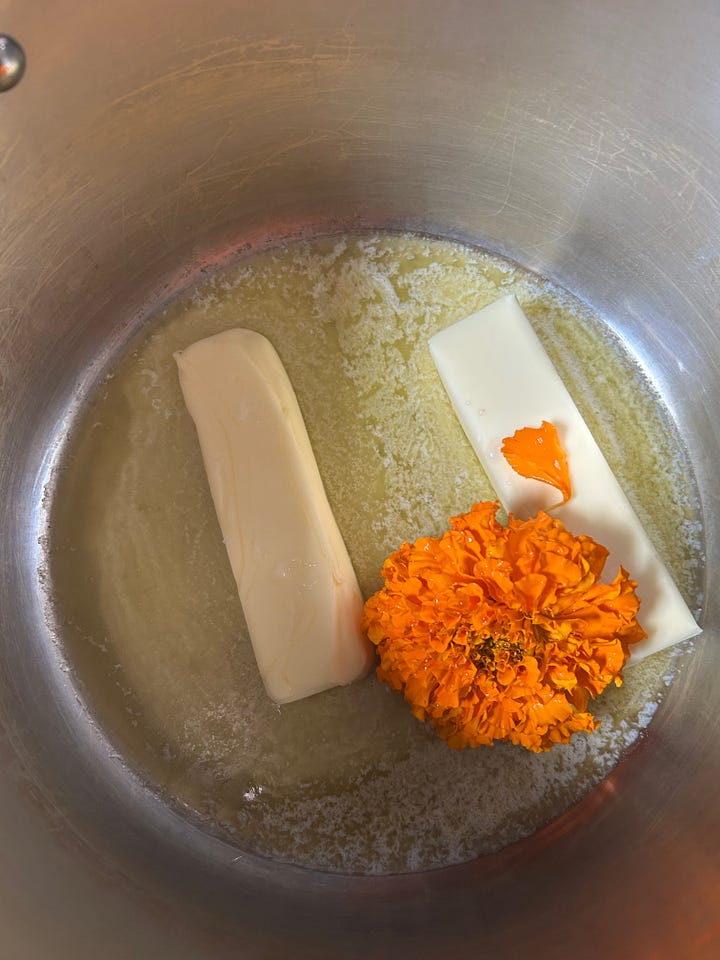 I followed my go-to cookbook, Julie Sanhi’s Classic Indian Cooking. Add two sticks of unsalted butter to a large pot, and slowly melt the sticks over low heat. Raise to medium-high heat and simmer the melted butter for about 10 minutes. Stop the heat when the frying sounds slow and you see the milk solids turn brown. Wait a few minutes to let the solids settle, then strain mixture into another container. I added a marigold to give the ghee a golden hue, worthy of the gods.