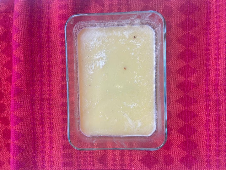 Before and after cooling. I think the marigold worked — the ghee looks like mango kulfi!